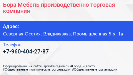 Бора-Мебель, производственно-торговая компания по адресу Северная Осетия, Владикавказ, Промышленная 5-я, 1а в дальнейшем Организация, размещена в следующих категориях: