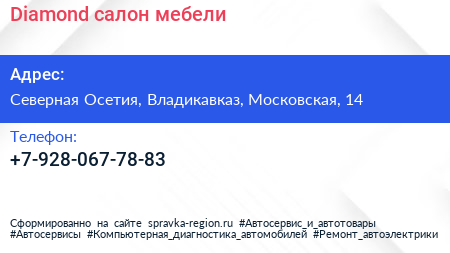 Diamond, салон мебели по адресу Северная Осетия, Владикавказ, Московская, 14 в дальнейшем Организация, размещена в следующих категориях: