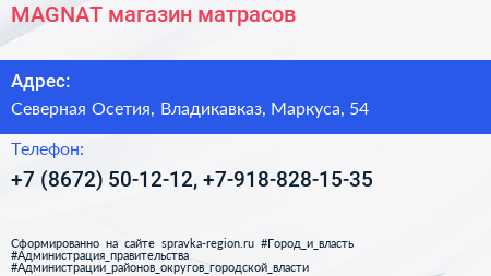 MAGNAT, магазин матрасов по адресу Северная Осетия, Владикавказ, Маркуса, 54 в дальнейшем Организация, размещена в следующих категориях:
