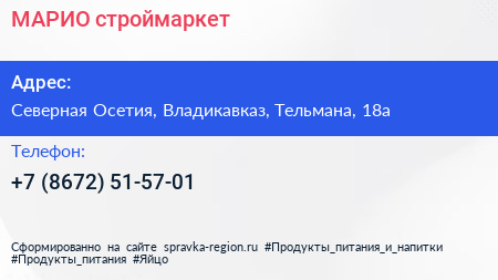 МАРИО, строймаркет по адресу Северная Осетия, Владикавказ, Тельмана, 18а в дальнейшем Организация, размещена в следующих категориях: