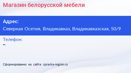 Магазин белорусской мебели по адресу Северная Осетия, Владикавказ, Владикавказская, 50/9 в дальнейшем Организация, размещена в следующих категориях: