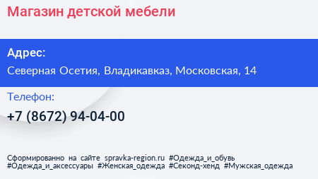 Магазин детской мебели по адресу Северная Осетия, Владикавказ, Московская, 14 в дальнейшем Организация, размещена в следующих категориях:
