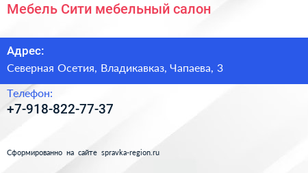 Мебель Сити, мебельный салон по адресу Северная Осетия, Владикавказ, Чапаева, 3 в дальнейшем Организация, размещена в следующих категориях: