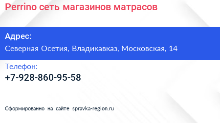 Perrino, сеть магазинов матрасов по адресу Северная Осетия, Владикавказ, Московская, 14 в дальнейшем Организация, размещена в следующих категориях: