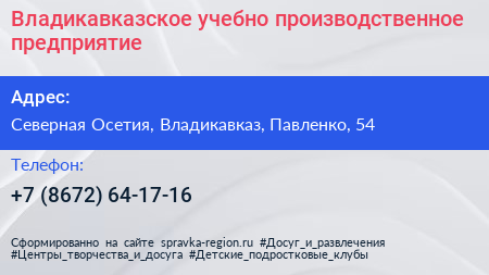 Владикавказское учебно-производственное предприятие по адресу Северная Осетия, Владикавказ, Павленко, 54 в дальнейшем Организация, размещена в следующих категориях: