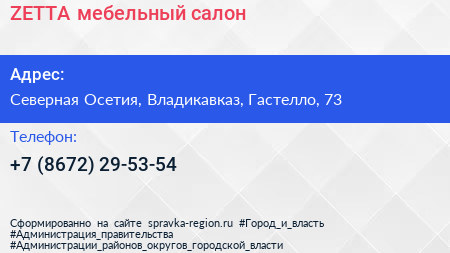 ZETTA, мебельный салон по адресу Северная Осетия, Владикавказ, Гастелло, 73 в дальнейшем Организация, размещена в следующих категориях: