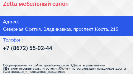Zetta, мебельный салон по адресу Северная Осетия, Владикавказ, проспект Коста, 215 в дальнейшем Организация, размещена в следующих категориях: