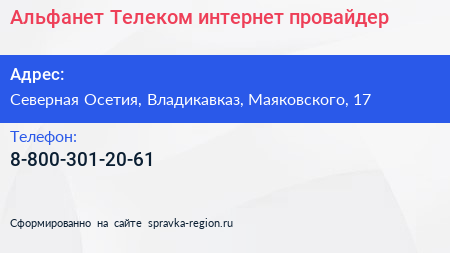 Альфанет Телеком, интернет-провайдер по адресу Северная Осетия, Владикавказ, Маяковского, 17 в дальнейшем Организация, размещена в следующих категориях:
