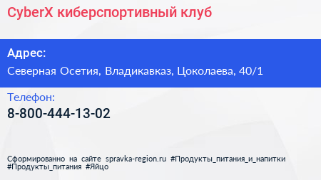 CyberX, киберспортивный клуб по адресу Северная Осетия, Владикавказ, Цоколаева, 40/1 в дальнейшем Организация, размещена в следующих категориях: