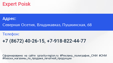 Expert-Poisk по адресу Северная Осетия, Владикавказ, Пушкинская, 68 в дальнейшем Организация, размещена в следующих категориях: