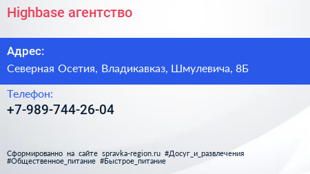 Highbase, агентство по адресу Северная Осетия, Владикавказ, Шмулевича, 8Б в дальнейшем Организация, размещена в следующих категориях: