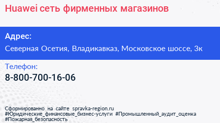 Huawei, сеть фирменных магазинов по адресу Северная Осетия, Владикавказ, Московское шоссе, 3к в дальнейшем Организация, размещена в следующих категориях: