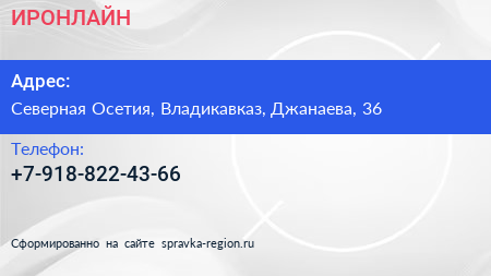ИРОНЛАЙН по адресу Северная Осетия, Владикавказ, Джанаева, 36 в дальнейшем Организация, размещена в следующих категориях: