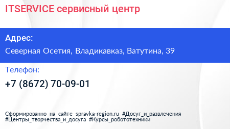 ITSERVICE, сервисный центр по адресу Северная Осетия, Владикавказ, Ватутина, 39 в дальнейшем Организация, размещена в следующих категориях: