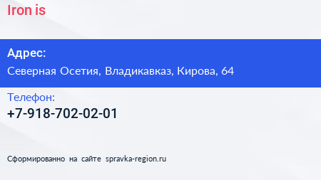 Iron-is по адресу Северная Осетия, Владикавказ, Кирова, 64 в дальнейшем Организация, размещена в следующих категориях:
