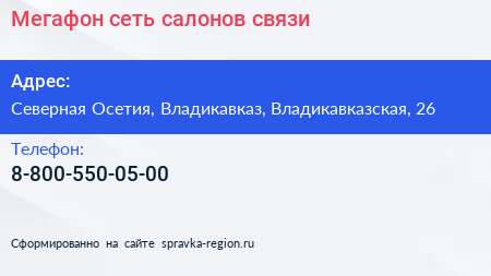 Мегафон, сеть салонов связи по адресу Северная Осетия, Владикавказ, Владикавказская, 26 в дальнейшем Организация, размещена в следующих категориях: