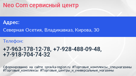 Neo.Com, сервисный центр по адресу Северная Осетия, Владикавказ, Кирова, 30 в дальнейшем Организация, размещена в следующих категориях:
