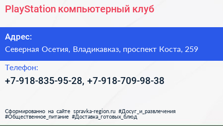 PlayStation, компьютерный клуб по адресу Северная Осетия, Владикавказ, проспект Коста, 259 в дальнейшем Организация, размещена в следующих категориях: