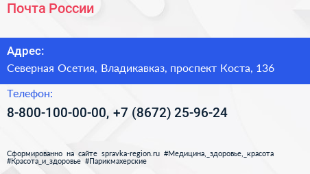 Почта России по адресу Северная Осетия, Владикавказ, проспект Коста, 136 в дальнейшем Организация, размещена в следующих категориях: