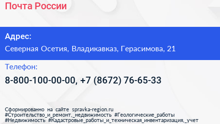 Почта России по адресу Северная Осетия, Владикавказ, Герасимова, 21 в дальнейшем Организация, размещена в следующих категориях: