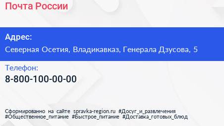 Почта России по адресу Северная Осетия, Владикавказ, Генерала Дзусова, 5 в дальнейшем Организация, размещена в следующих категориях: