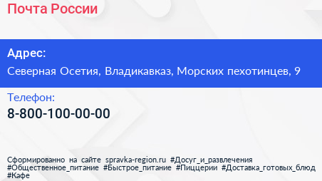Почта России по адресу Северная Осетия, Владикавказ, Морских пехотинцев, 9 в дальнейшем Организация, размещена в следующих категориях: