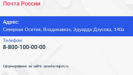 Почта России по адресу Северная Осетия, Владикавказ, Эдуарда Дзусова, 140а в дальнейшем Организация, размещена в следующих категориях: