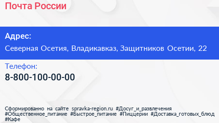 Почта России по адресу Северная Осетия, Владикавказ, Защитников Осетии, 22 в дальнейшем Организация, размещена в следующих категориях: