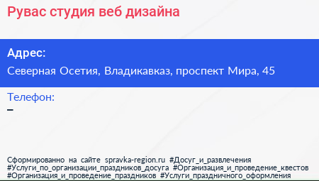 Рувас, студия веб-дизайна по адресу Северная Осетия, Владикавказ, проспект Мира, 45 в дальнейшем Организация, размещена в следующих категориях: