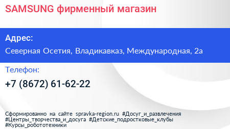 SAMSUNG, фирменный магазин по адресу Северная Осетия, Владикавказ, Международная, 2а в дальнейшем Организация, размещена в следующих категориях:
