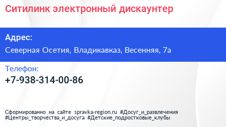Ситилинк, электронный дискаунтер по адресу Северная Осетия, Владикавказ, Весенняя, 7а в дальнейшем Организация, размещена в следующих категориях: