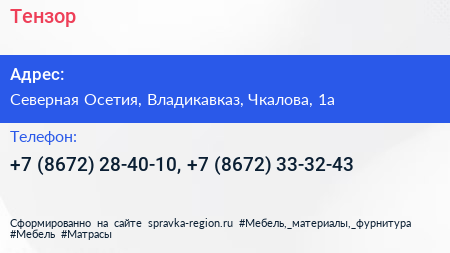 Тензор по адресу Северная Осетия, Владикавказ, Чкалова, 1а в дальнейшем Организация, размещена в следующих категориях: