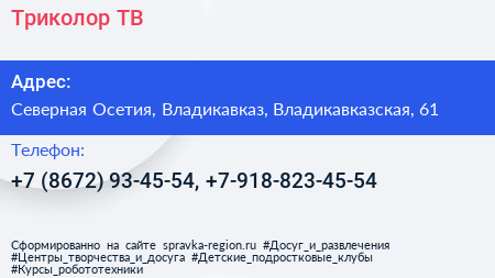 Триколор ТВ по адресу Северная Осетия, Владикавказ, Владикавказская, 61 в дальнейшем Организация, размещена в следующих категориях: