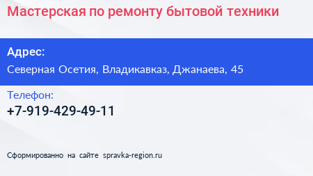 Мастерская по ремонту бытовой техники по адресу Северная Осетия, Владикавказ, Джанаева, 45 в дальнейшем Организация, размещена в следующих категориях: