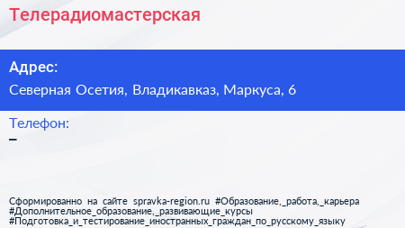 Телерадиомастерская по адресу Северная Осетия, Владикавказ, Маркуса, 6 в дальнейшем Организация, размещена в следующих категориях: