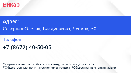 Викар по адресу Северная Осетия, Владикавказ, Ленина, 50 в дальнейшем Организация, размещена в следующих категориях: