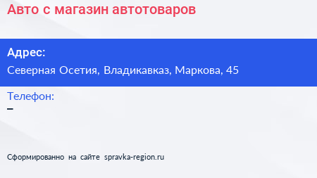 Авто-с, магазин автотоваров по адресу Северная Осетия, Владикавказ, Маркова, 45 в дальнейшем Организация, размещена в следующих категориях: