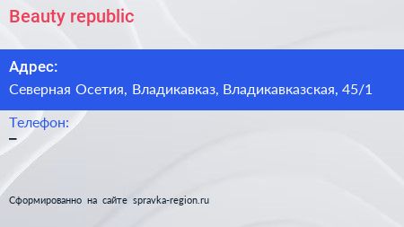 Beauty republic по адресу Северная Осетия, Владикавказ, Владикавказская, 45/1 в дальнейшем Организация, размещена в следующих категориях: