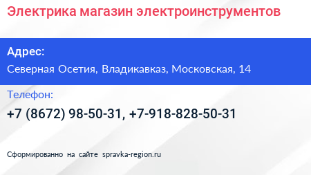 Электрика, магазин электроинструментов по адресу Северная Осетия, Владикавказ, Московская, 14 в дальнейшем Организация, размещена в следующих категориях: