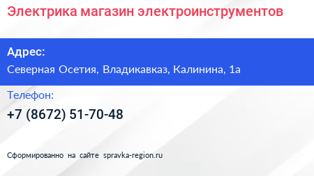 Электрика, магазин электроинструментов по адресу Северная Осетия, Владикавказ, Калинина, 1а в дальнейшем Организация, размещена в следующих категориях: