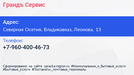 Грандъ-Сервис по адресу Северная Осетия, Владикавказ, Леонова, 13 в дальнейшем Организация, размещена в следующих категориях: