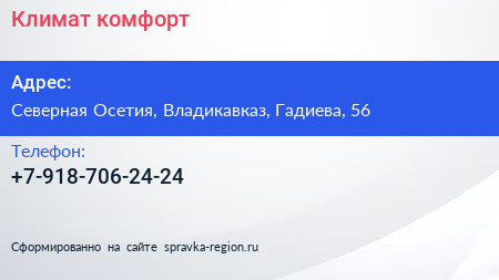 Климат комфорт по адресу Северная Осетия, Владикавказ, Гадиева, 56 в дальнейшем Организация, размещена в следующих категориях: