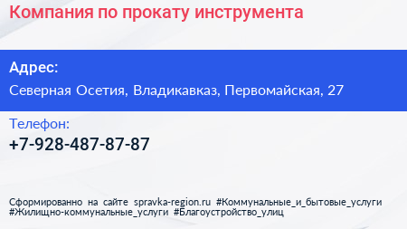 Компания по прокату инструмента по адресу Северная Осетия, Владикавказ, Первомайская, 27 в дальнейшем Организация, размещена в следующих категориях:
