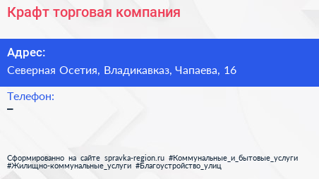 Крафт, торговая компания по адресу Северная Осетия, Владикавказ, Чапаева, 16 в дальнейшем Организация, размещена в следующих категориях: