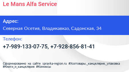 Le Mans & Alfa Service по адресу Северная Осетия, Владикавказ, Садонская, 34 в дальнейшем Организация, размещена в следующих категориях: