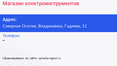 Магазин электроинструментов по адресу Северная Осетия, Владикавказ, Гадиева, 11 в дальнейшем Организация, размещена в следующих категориях: