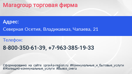 Maragroup, торговая фирма по адресу Северная Осетия, Владикавказ, Чапаева, 21 в дальнейшем Организация, размещена в следующих категориях: