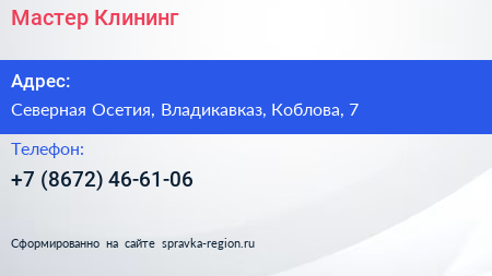 Мастер Клининг по адресу Северная Осетия, Владикавказ, Коблова, 7 в дальнейшем Организация, размещена в следующих категориях: