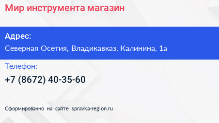 Мир инструмента, магазин по адресу Северная Осетия, Владикавказ, Калинина, 1а в дальнейшем Организация, размещена в следующих категориях: