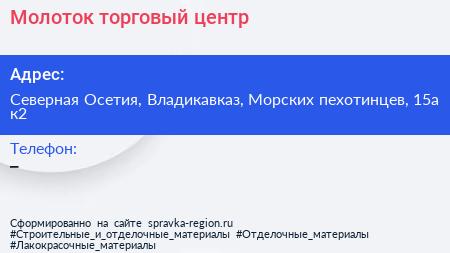Молоток, торговый центр по адресу Северная Осетия, Владикавказ, Морских пехотинцев, 15а к2 в дальнейшем Организация, размещена в следующих категориях: